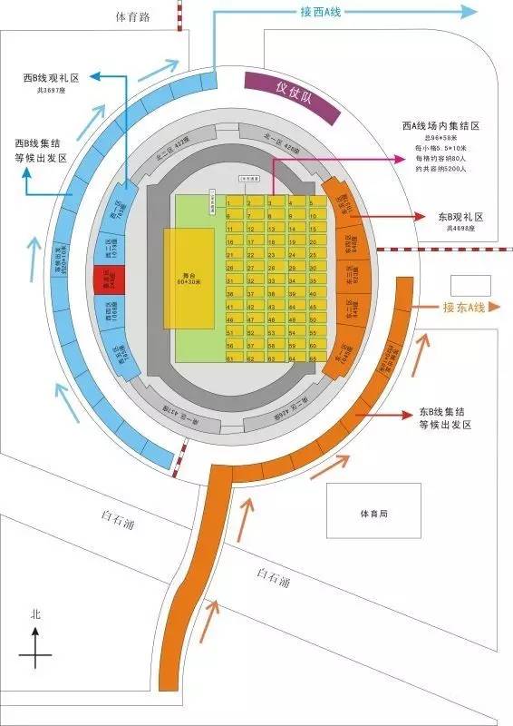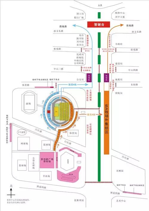 分别是兴中道东侧马路、兴中体育场场外空地(东看台、西看台)、兴中体育场内球场,分别为东A、东B、西B、西A集结区,巡游前将举行队伍抽签活动。