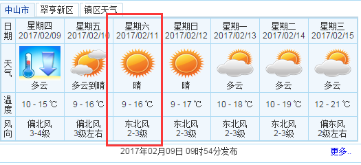 根据中山气象台2月9日上午发布的气象情况,今日受冷空气影响,气温明显下降;预计未来几天天气逐渐转晴好。早晚天气寒冷,请注意添衣加被;天气干燥,请注意森林防火及家居用火用电安全。
