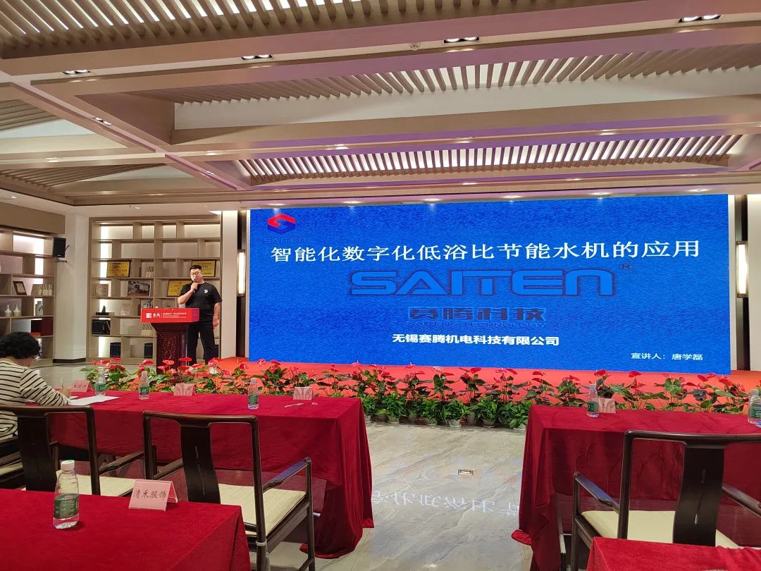 无锡赛腾机电科技有限公司副总经理唐学磊分享了《智能化数字化低浴比节能水机的应用》。唐学磊说:“无锡赛腾生产的新型节能低浴比洗染机在节能、节水、管理及节省人工成本等方面具有较强优势。例如:ST-S4208低浴比水洗机的浴化为1:2-1:8,可减少污水排放80%,增加衣裤容量50%,缩短水洗生产时间。”