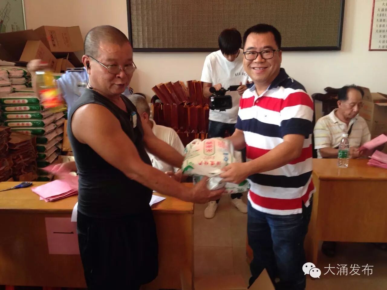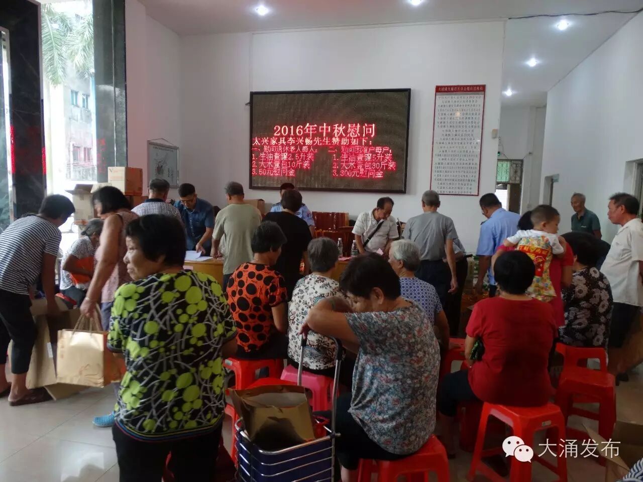 据了解,今年的中秋节老人慰问金和慰问品,依然由太兴家具公司李兴畅先生、丹尼斯服饰公司萧耀基先生、富茂石油化工公司陈伟纳先生等热心人士和大涌居委会、老人福利会共同派发,社区户籍55周岁以上女性和60周岁以上男性都可以到场领取,包括250元中秋慰问金和两盒月饼、一包大米和一罐香油等慰问品。