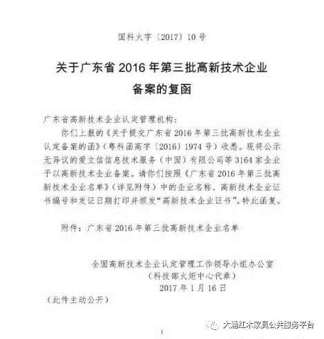 广东省2016年第三批高新技术企业名单公布,3164家企业予以高新技术企业备案,其中包括中山市大涌镇大自然木业有限公司,东成家具有限公司,太兴家具有限公司3家企业!