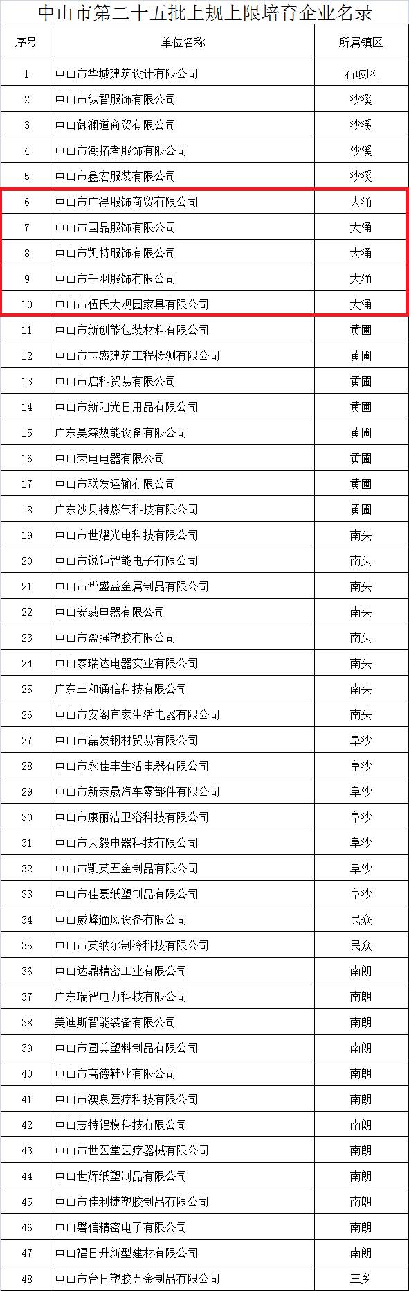 近日,中山市经信局公布了第二十五批上规上限培育企业名录,大涌共有五家企业上榜。