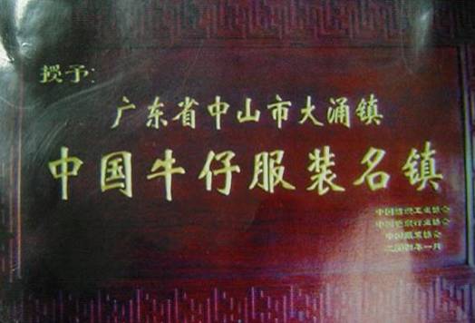 ▲2004年1月9日,中国纺织工业协会授予大涌镇“中国牛仔服装名镇”称号