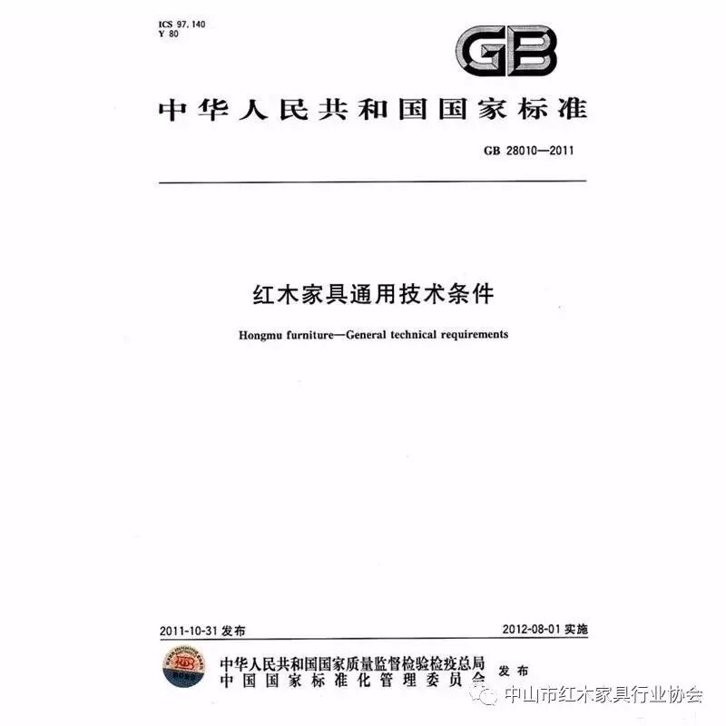由中山市鸿发家具有限公司作为主要制订起草单位,由国家质量监督检验检疫总局、国家标准化管理委员会发布的《红木家具通用技术条件》(GB28010-2011)正式实施,它对红木家具进行了技术规范,包含红木家具的术语、定义、产品命名、分类、主要尺寸、要求和质量明式卡等多项内容,这些都红木家具企业提出了更高的要求。