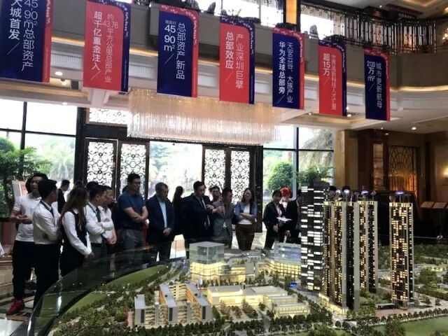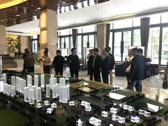 当天,由大涌镇党委副书记、镇长贺修虎带领的考察调研团一行首先来到了位于深圳龙岗区坂田街道的佳兆业城市广场。在营销中心内,通过工作人员对项目沙盘的介绍,考察团一行对该项目有了初步的了解。