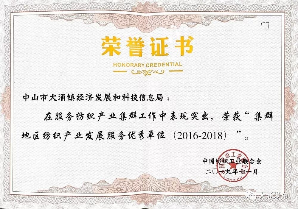 同时,大涌镇经济发展和科技信息局被中国纺织工业联合会评为“集群地区纺织产业发展服务优秀单位”称号,以表彰其在服务纺织产业集群工作中的突出表现。