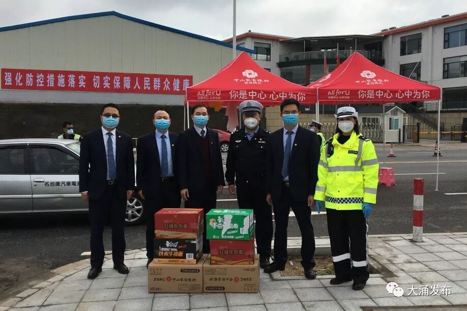 2月13日,中山农商银行大涌支行党支部向风雨中坚守岗位的一线工作人员送去慰问,送上阳光蓬、矿泉水、方便面、纸巾、雨伞等物资,为他们鼓劲加油。