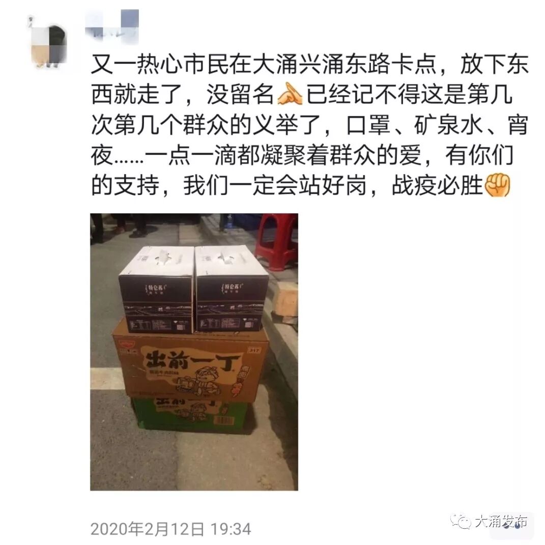 2月12日晚,在大涌兴涌东路卡点,一名市民向防疫工作人员送来了二箱面和牛奶后就匆忙离开了。