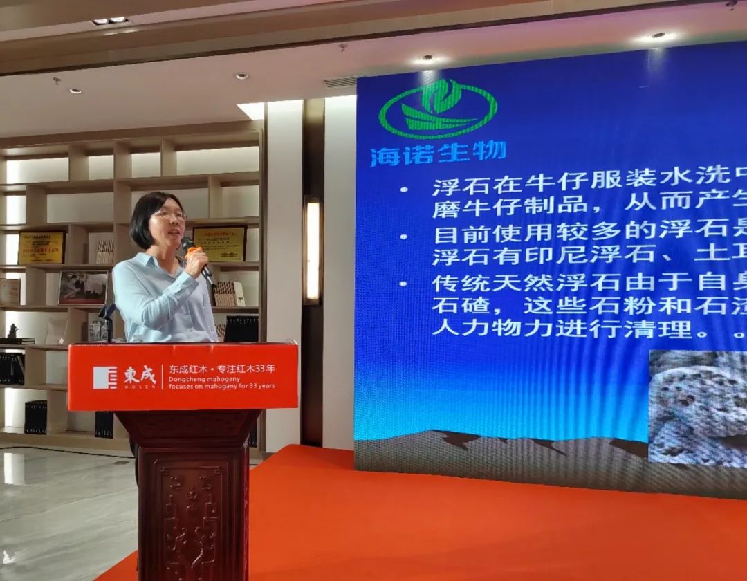 广州市海诺生物工程有限公司技术经理王晓丽为大家介绍了《环保浮石和无水柔软技术在牛仔服装水洗中的应用》。据介绍,环保浮石是通过长期的科技攻关和大量的试验,优选合适的材料,模拟浮石生成条件制造的环保浮石较天然浮石孔隙更均匀、比重更一致、更耐摩、与服装的亲和性更好,是一种既绿色环保,大幅减少污泥产生,又更能洗出牛仔服装效果的新型洗水材料。