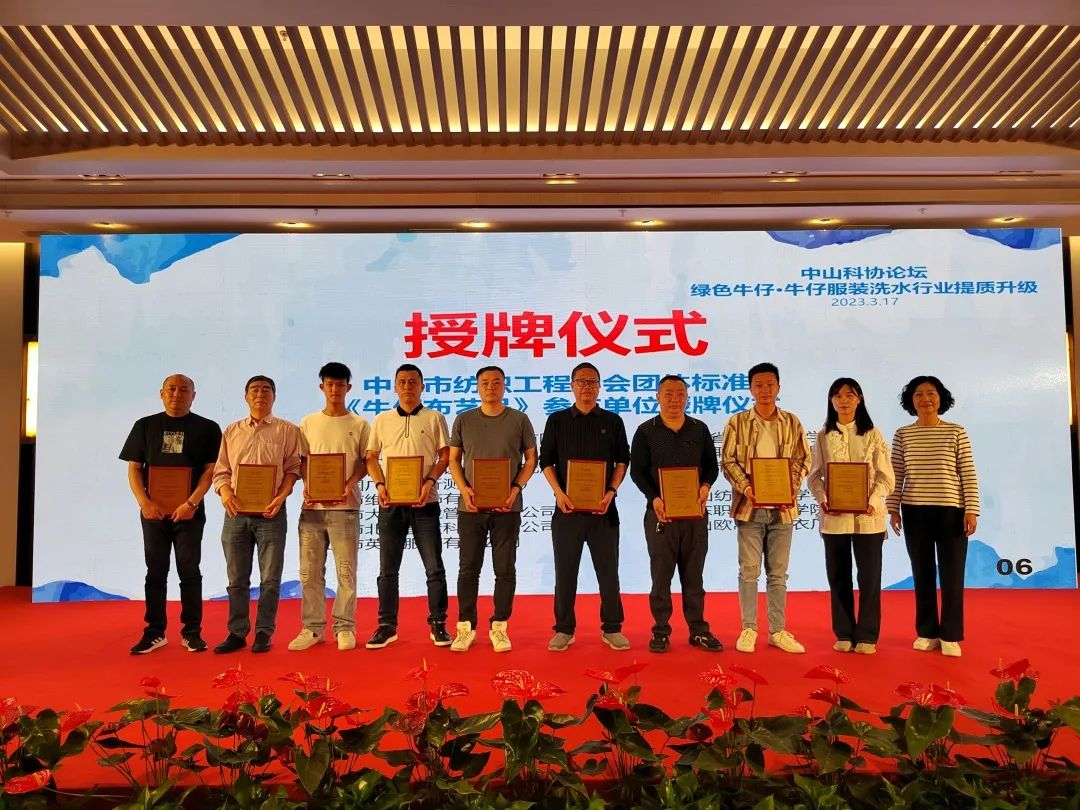 随后,分别进行了中山市纺织工程学会团体标准《拼接牛仔服装》和《牛仔布艺品》参与单位授牌仪式。据主持人介绍,中山市纺织工程学会作为学术型社会组织,致力于为行业搭建共建共享的学术和科普公共服务平台。目前,学会已建有100多名专家组成的“三维一体”科技智库,设有团标委、数字化智能化专业委员会,是广东省商务厅备案的沙溪镇休闲服装外贸转型升级基地工作站,是中山市市场监督管理局沙溪分局认定的质量提升综合服务平台。近年来,学会在标准化建设上积极探索,努力开拓,共参与了一项国家标准、三项行业标准、组织起草了十余项团体标准,并参与了十余项省级团体标准。